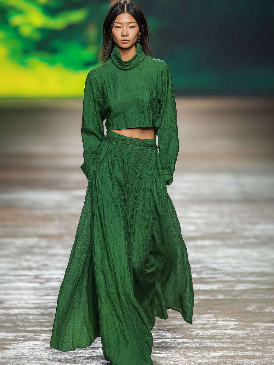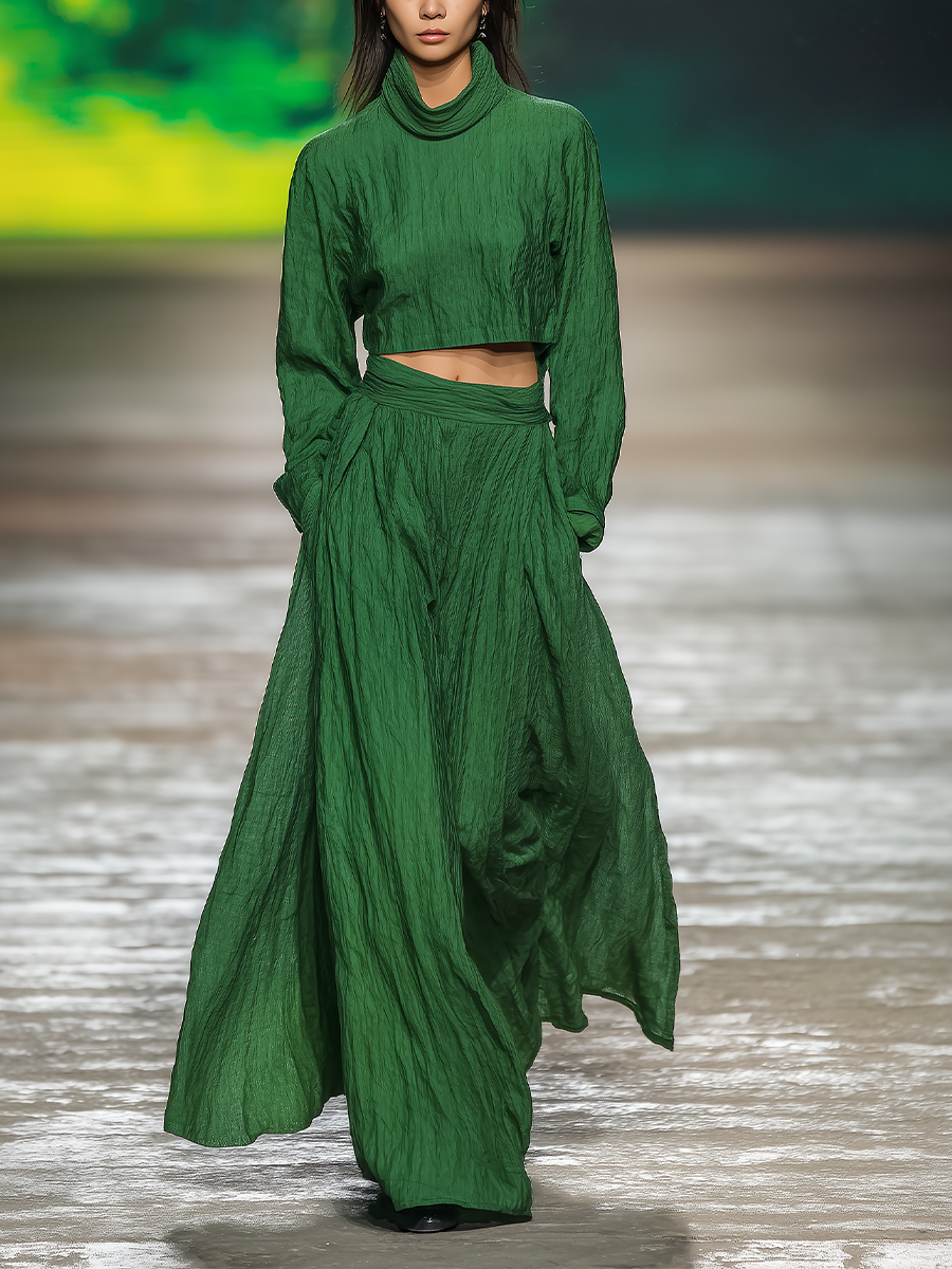 Women's Emerald Green Pleated Cotton Blend Turtleneck Two-Piece Set MDA0485L6T