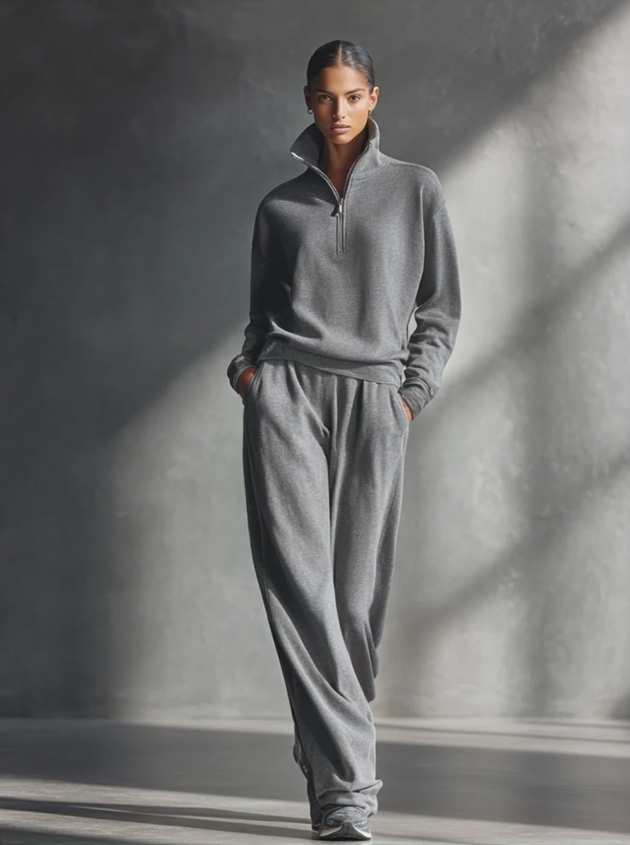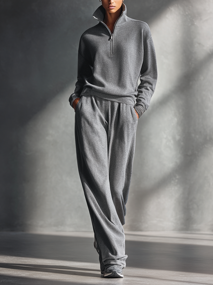 Women's Grey Half-Zip Sweatshirt And Wide-Leg Pants Loungewear Set MDA0532L4AP