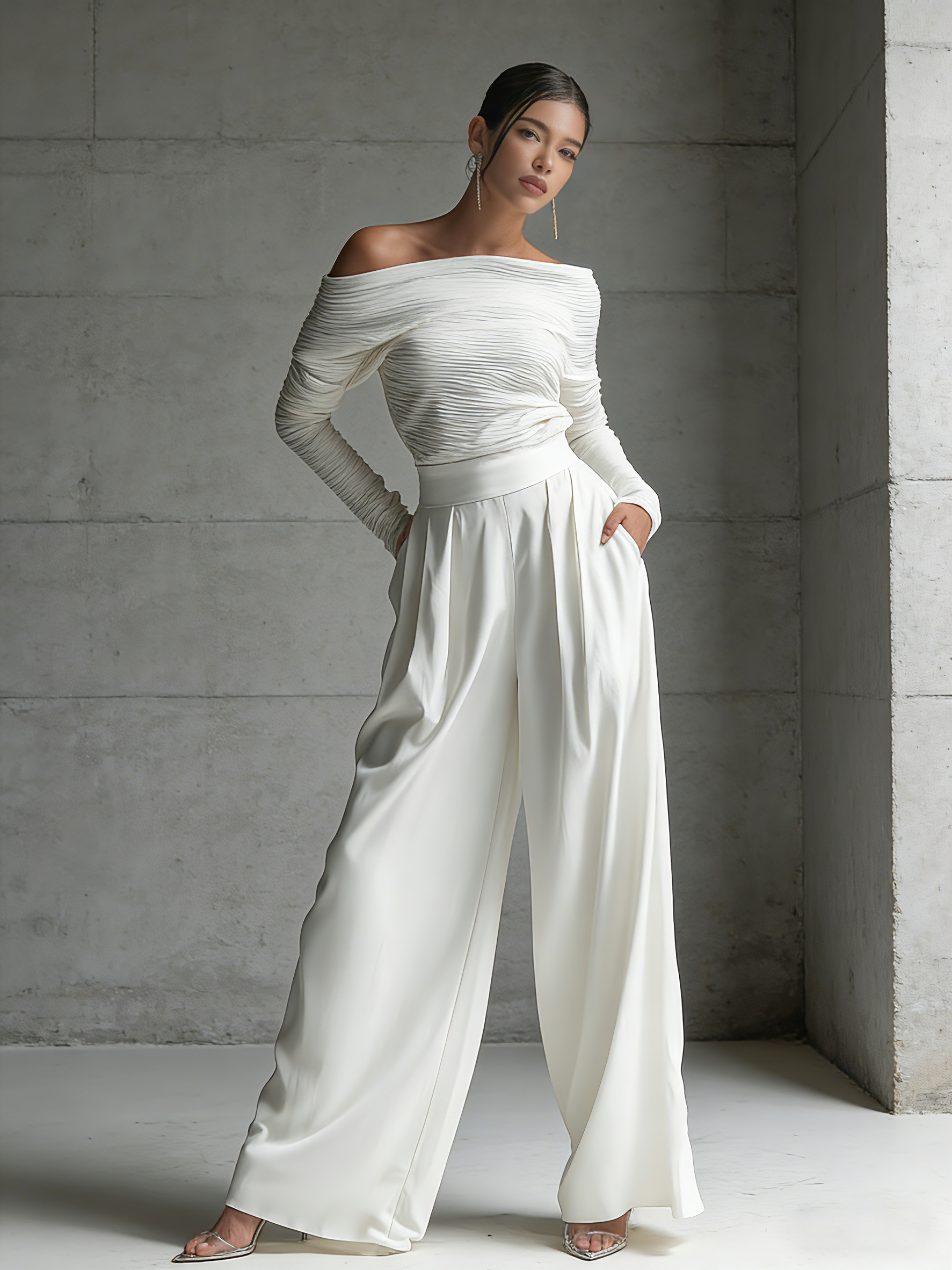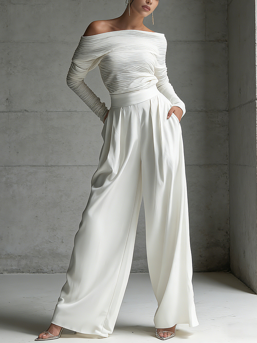 Women's Minimalist Off-the-shoulder Long-sleeved Shirt And Wide-leg Pants Set MDA0925L8Y