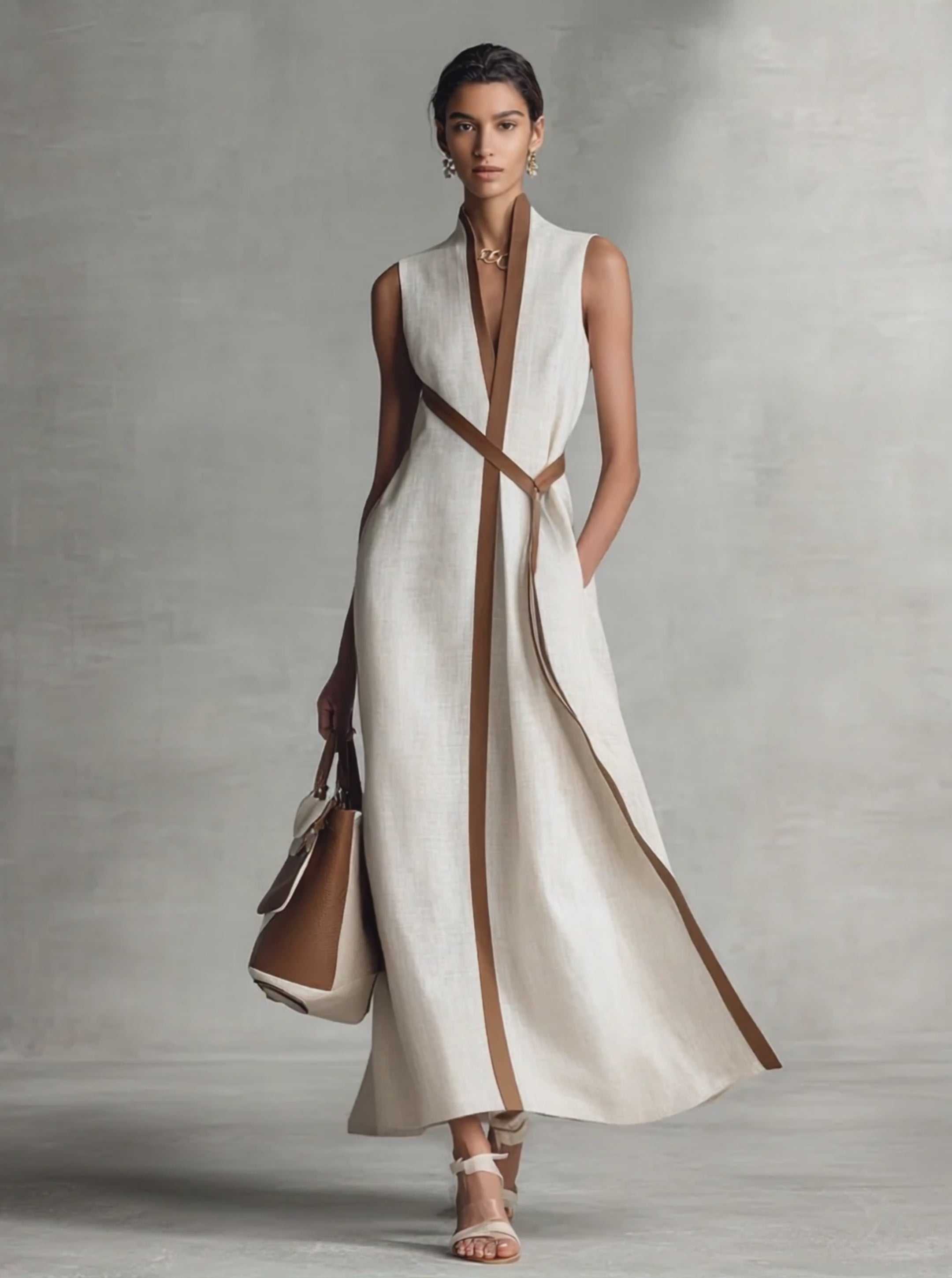 Women's Sleeveless V-Neck Tie-Waist Cotton Linen Maxi Dress MDZ1153B7BA
