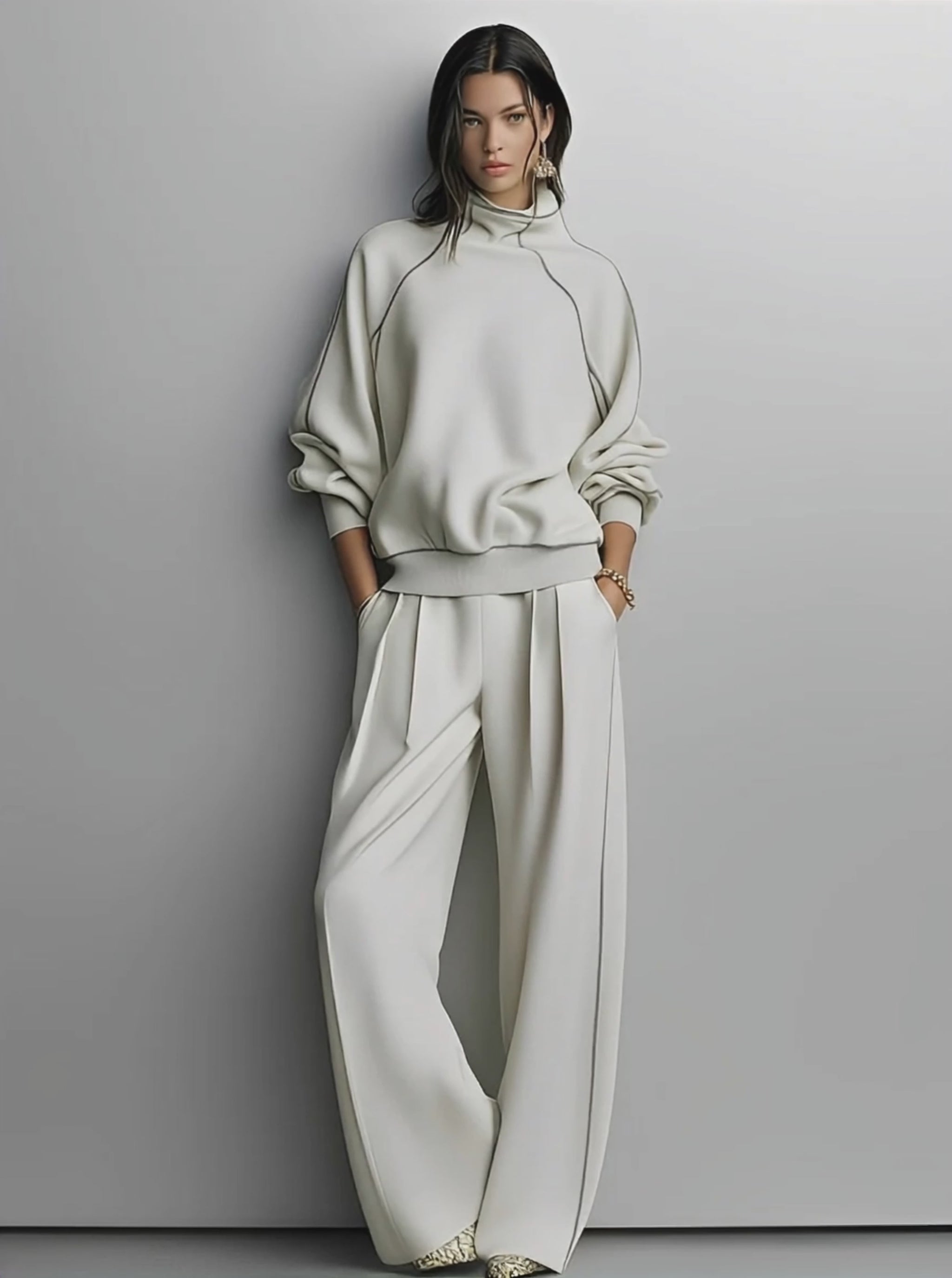 A beige textured knit set with contrast piping and pleated pants. It’s effortless chic for everyday wear.