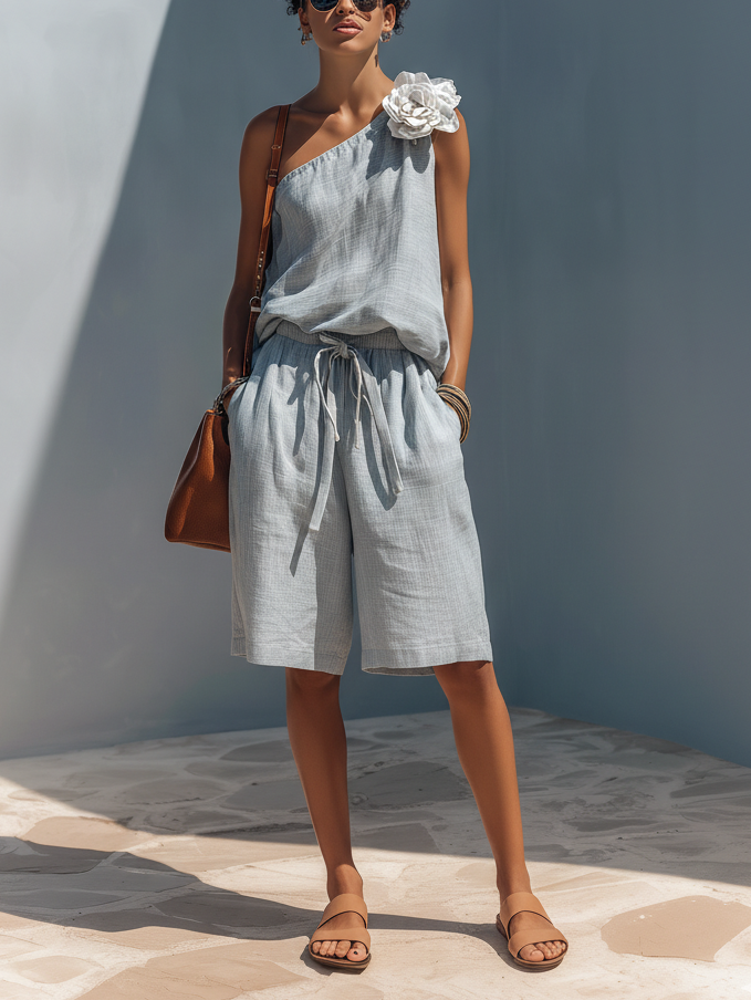 Women's Casual Light Blue Cotton Linen Off-shoulder Sleeveless Top Paired With Shorts (removable White Floral Embellishment) MDZ2715B1AN