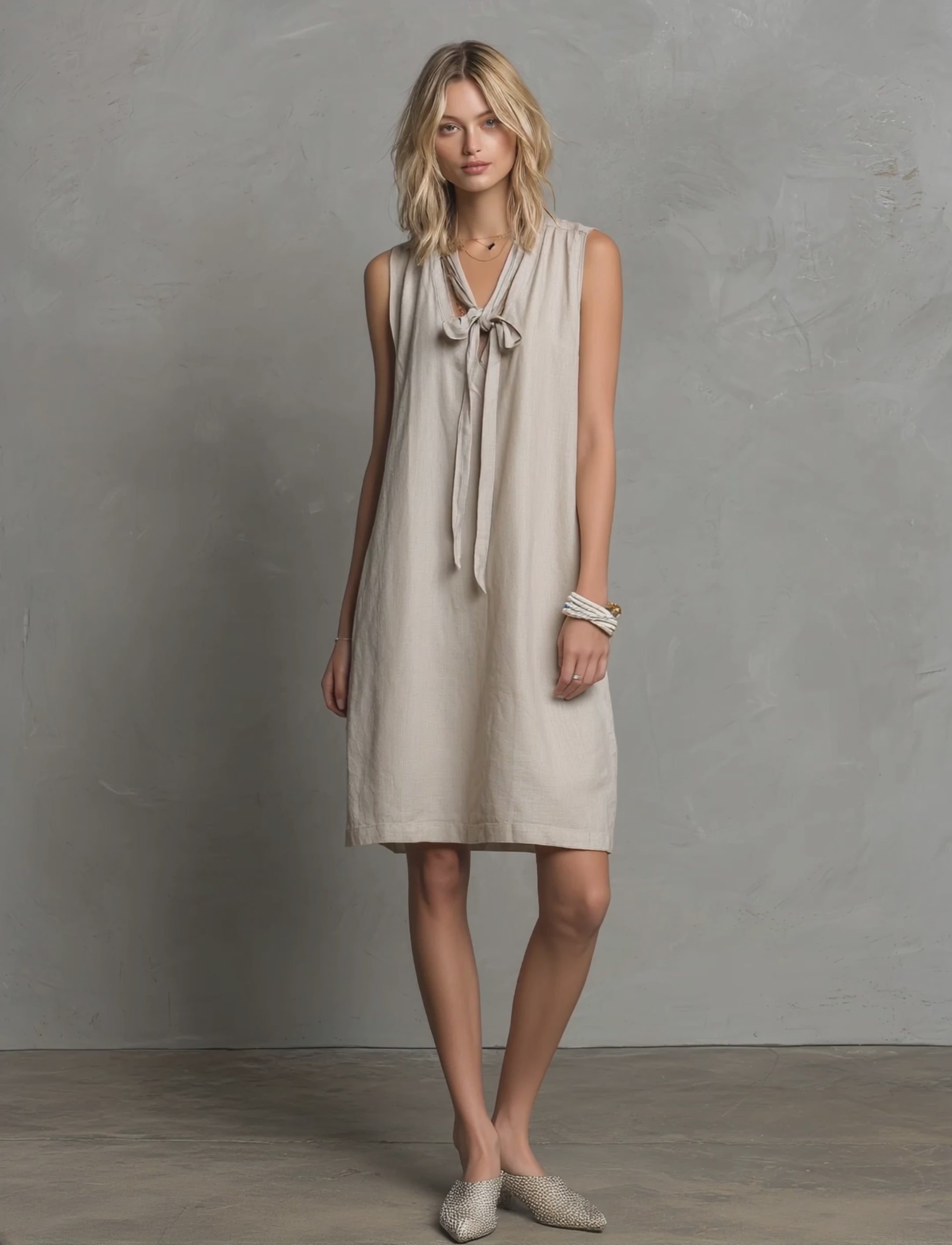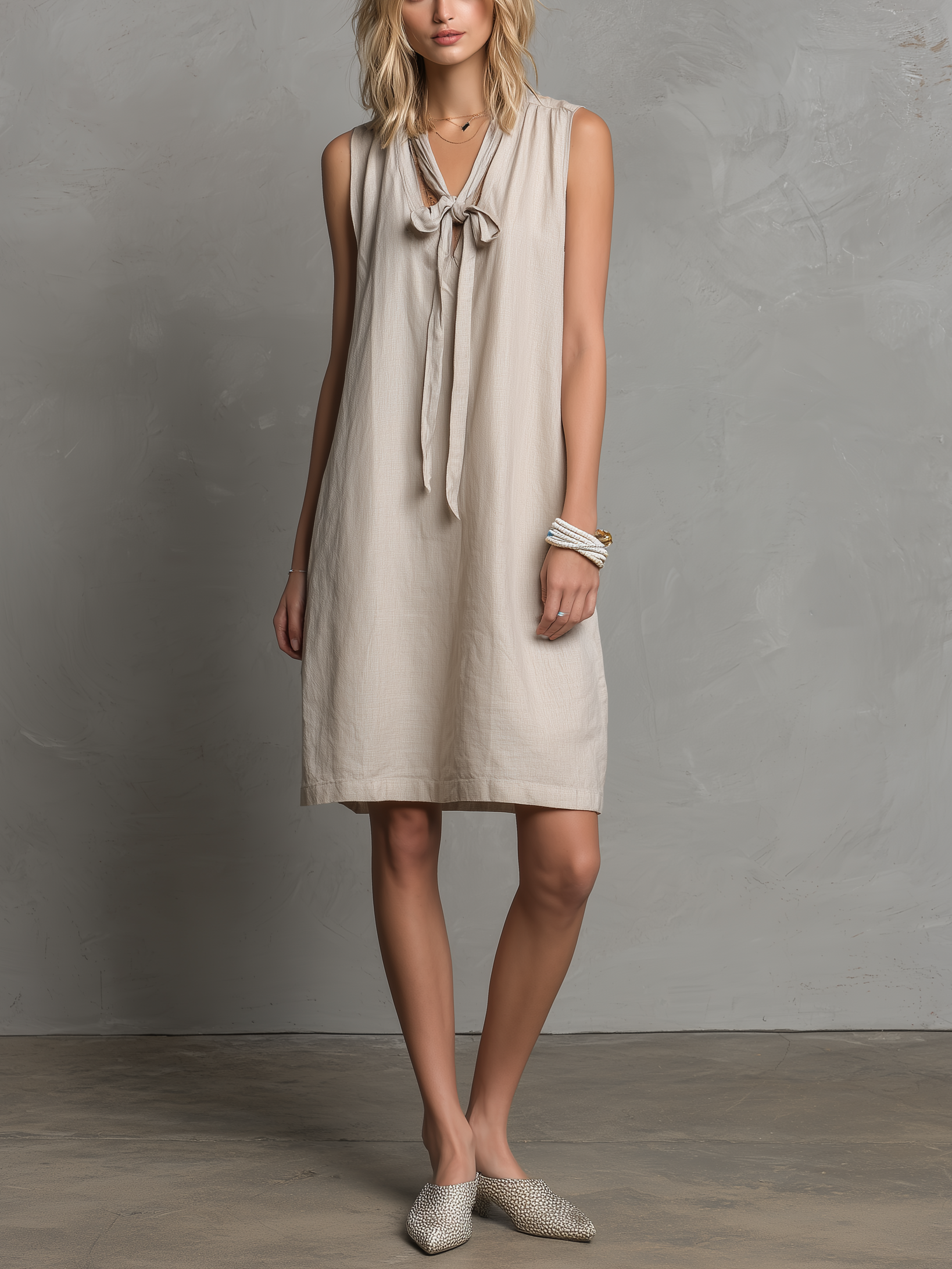 Women's Simple Beige Cotton Linen V-neck Sleeveless Loose Midi Dress MDZ2573B9AN