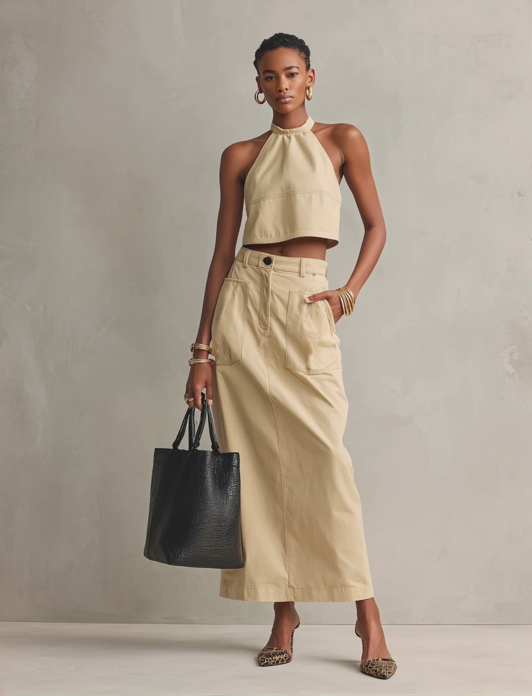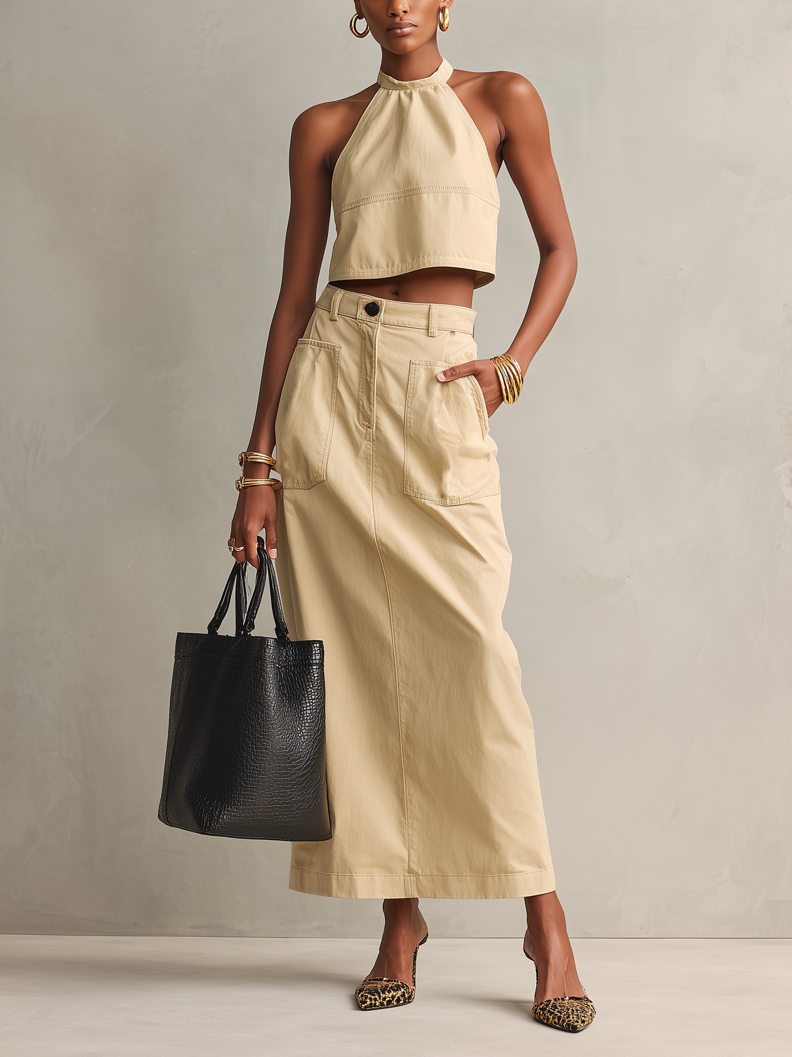 Women's Elegant Beige Woven Halter Neck Sleeveless Top Paired With A Skirt Set MDZ2735B2AN