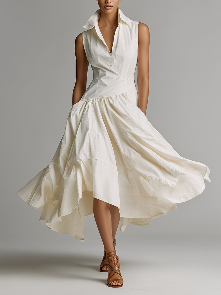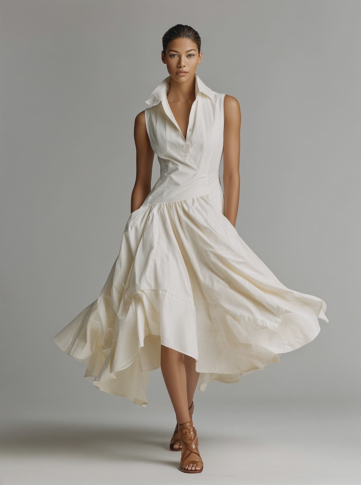Women's Ivory Cotton Dress With Collared V-Neck & Asymmetric Ruffle Hem, Timeless Minimalist-Elegant Style Dress MDZ1188B7I