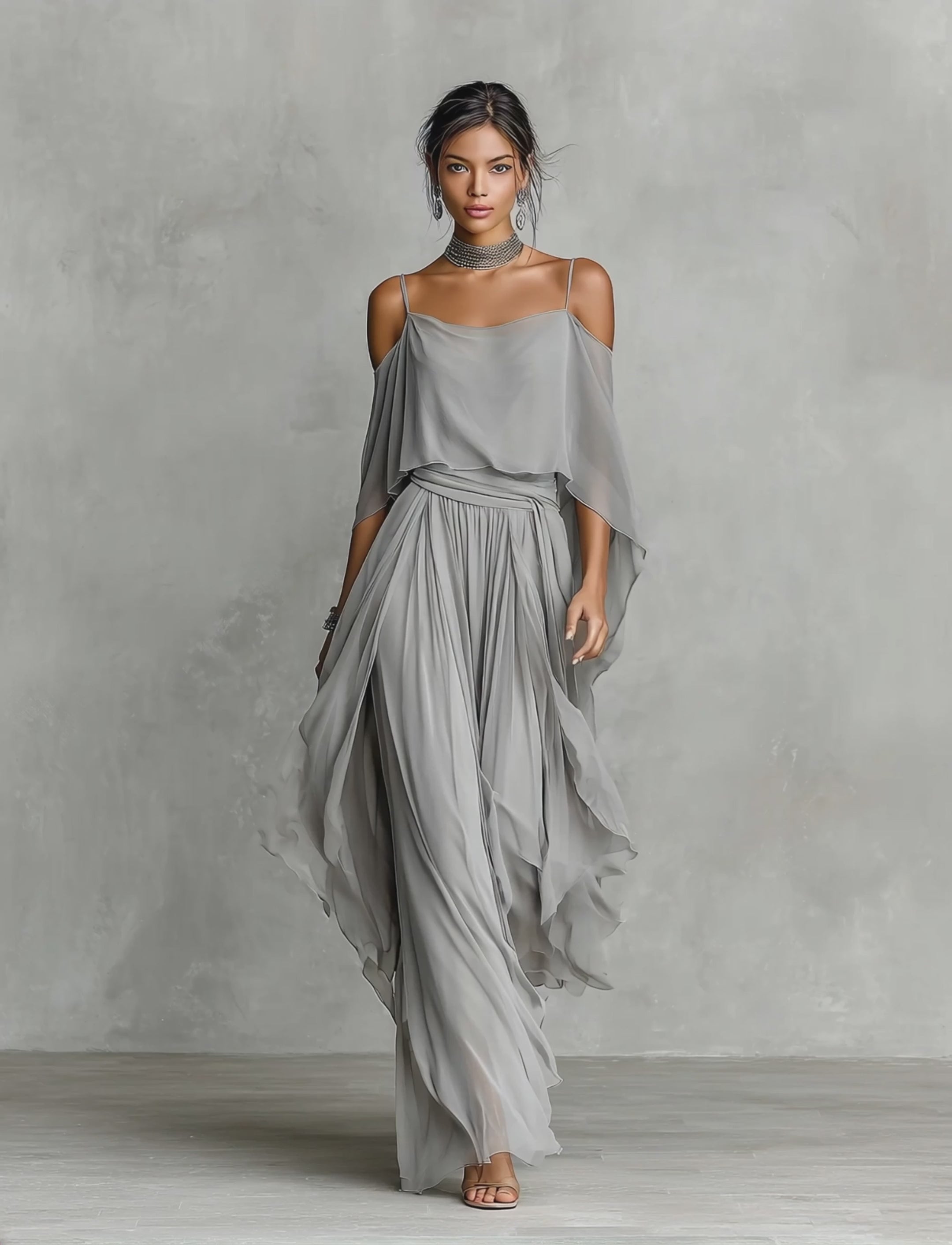 Women's Grey Breathable Chiffon Set With Cold-Shoulder Detail & Flared Silhouette, Contemporary Luxury-Feminine Style Set MDZ2651B6I
