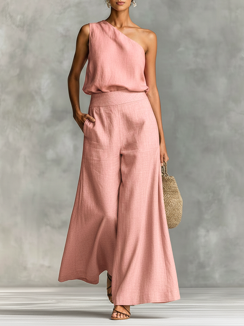 Women's Minimalist Linen Blend One-shoulder Blouse And Wide-leg Pants Set MDZ0377B4Y