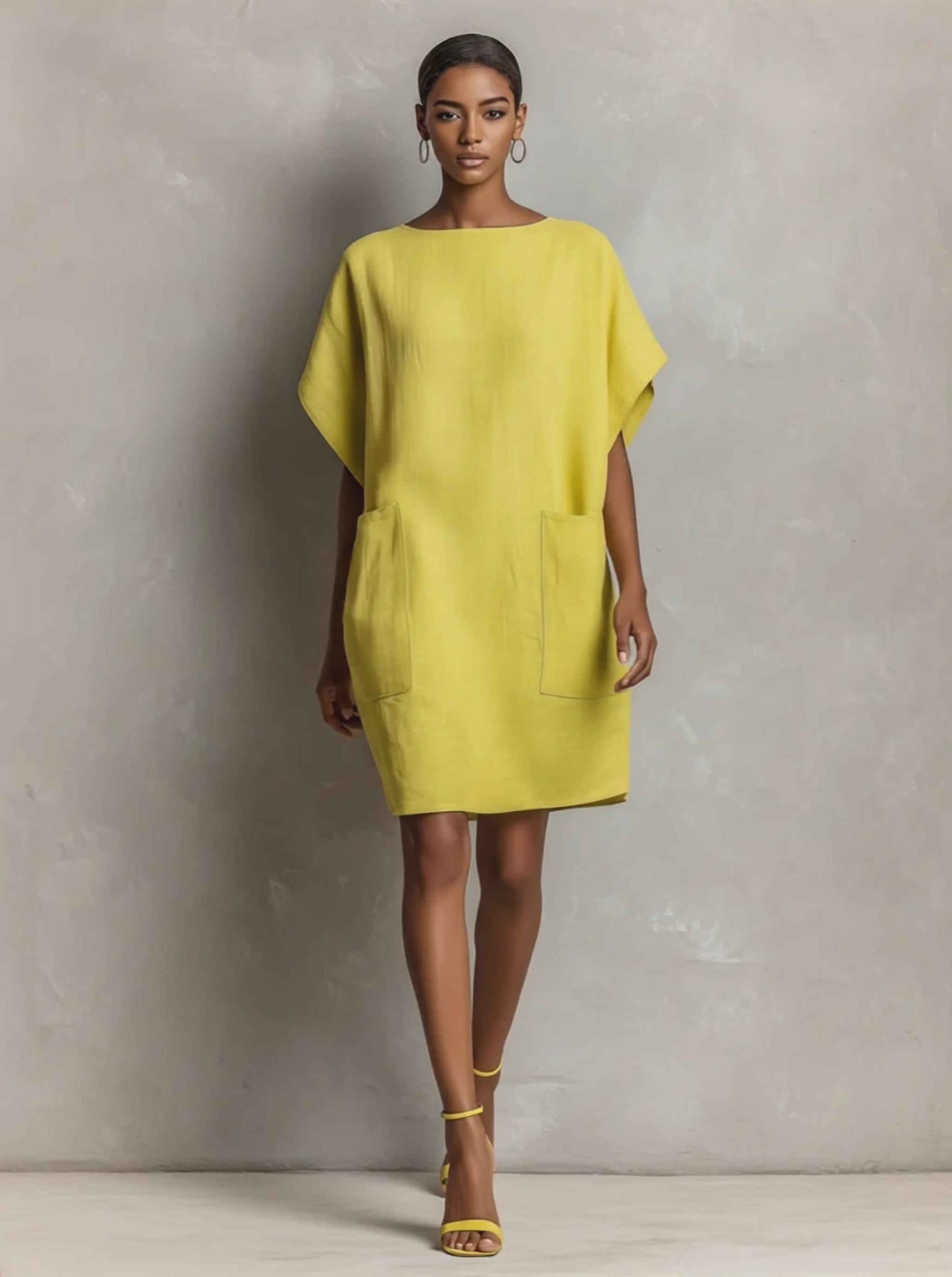 A lime yellow linen-blend shift dress with batwing sleeves and patch pockets for an easy, sunny look.