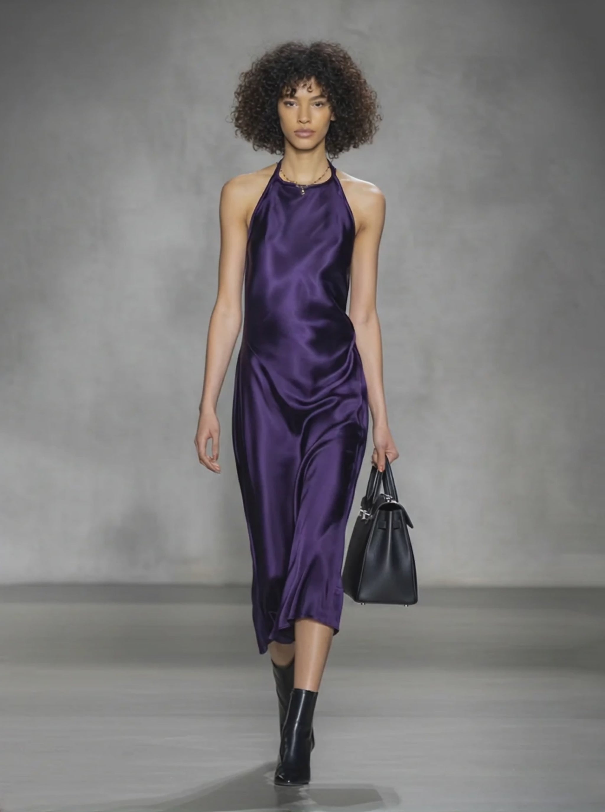 This elegant purple midi dress, crafted from luxurious satin fabric, features a sophisticated halter neckline and a fluid slip silhouette. The rich purple hue and soft sheen of the satin create a captivating and alluring look, while the midi length offers a balance of elegance and modernity. Perfect for evening events, cocktail parties, or a stylish night out.
