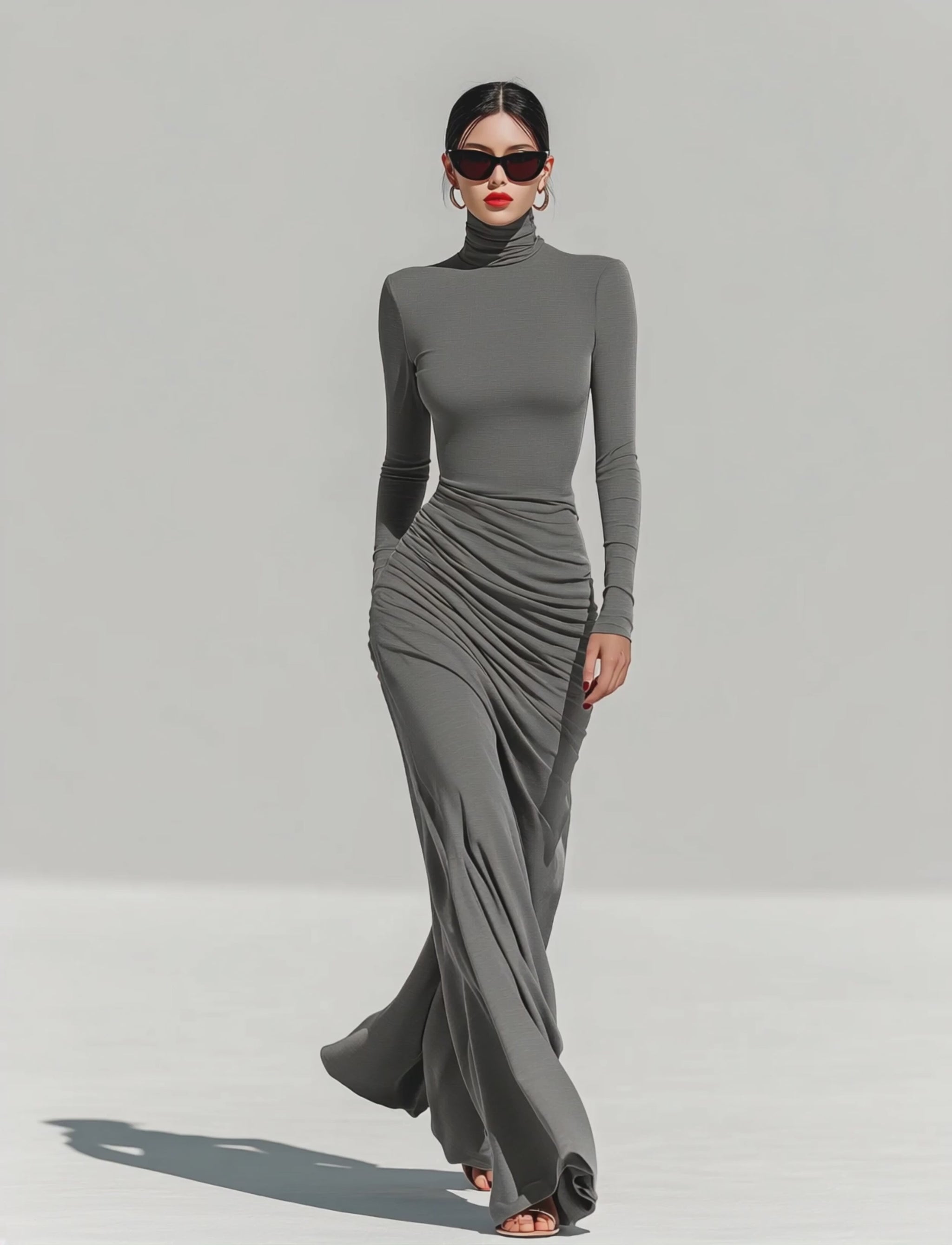 This gray turtleneck slim-fit maxi dress blends elegance with everyday versatility. Crafted from a soft and stretchy knit fabric, it gently contours the body while providing exceptional comfort. The long sleeves and high neckline create a refined, streamlined silhouette, while the maxi length adds an effortlessly graceful finish. Minimalist yet sophisticated, this dress transitions seamlessly from casual outings to elevated occasions with the right accessories.