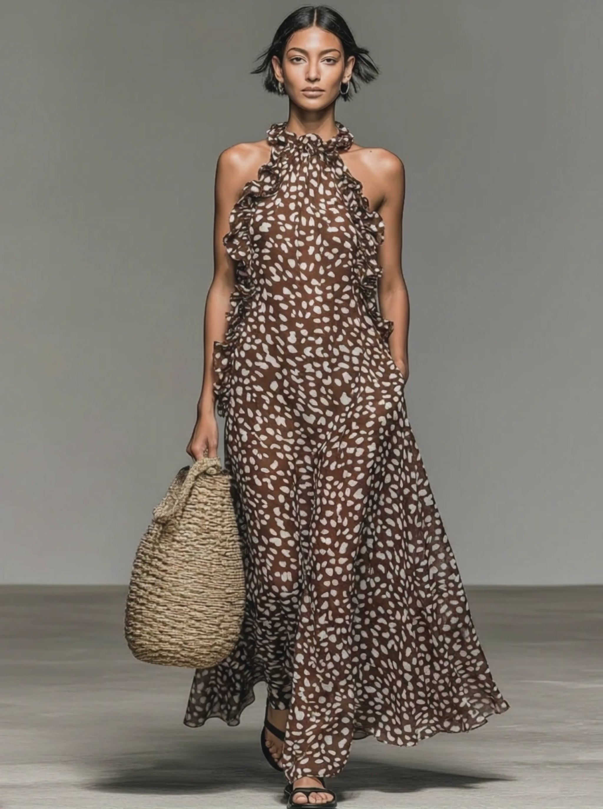 A charming minimalist maxi dress featuring a delicate deer print and soft ruffled collar, designed with a sleeveless silhouette for a graceful, nature-inspired look.