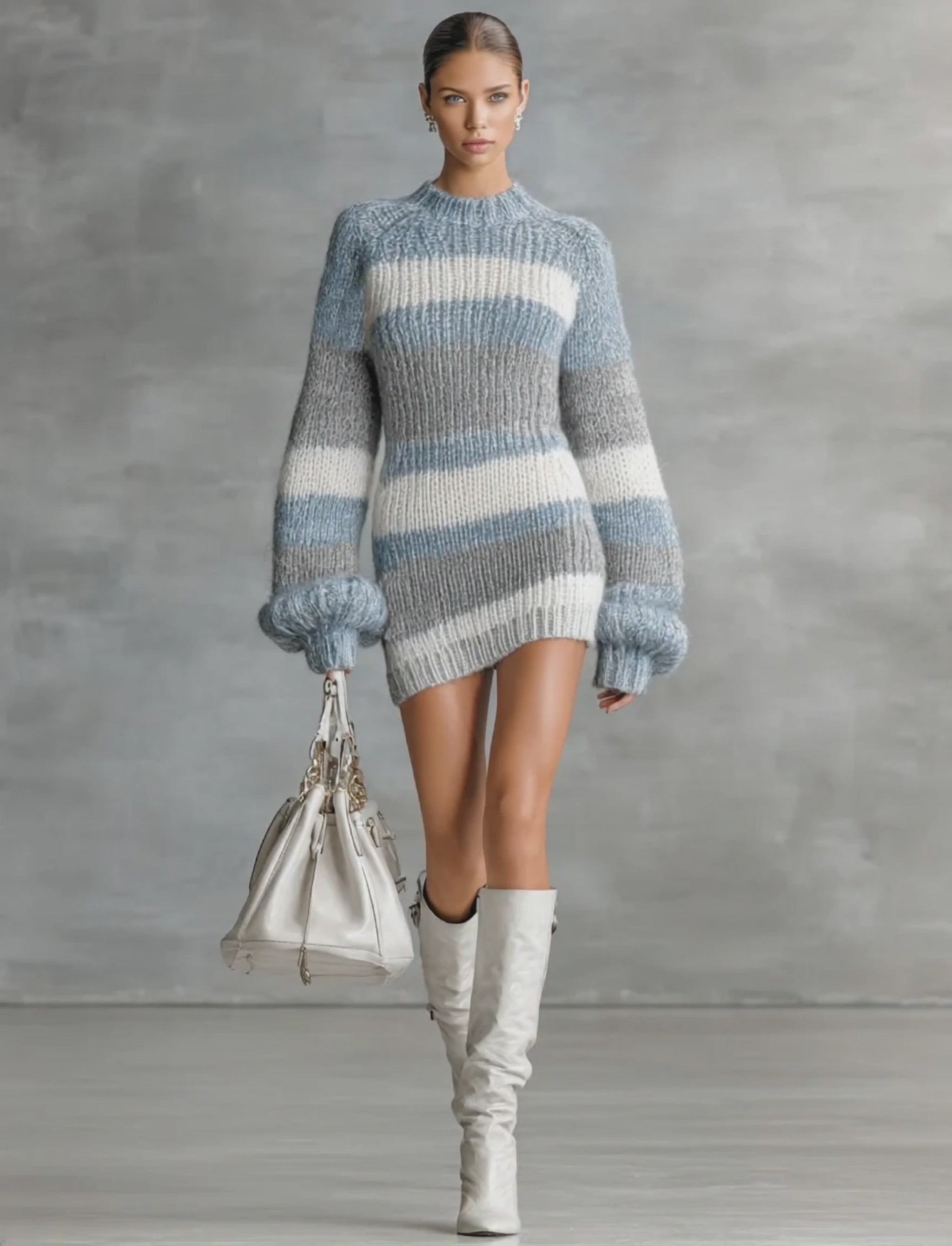 Women's Minimalist Knit Multicolor Striped Crew Neck Mini Dress
